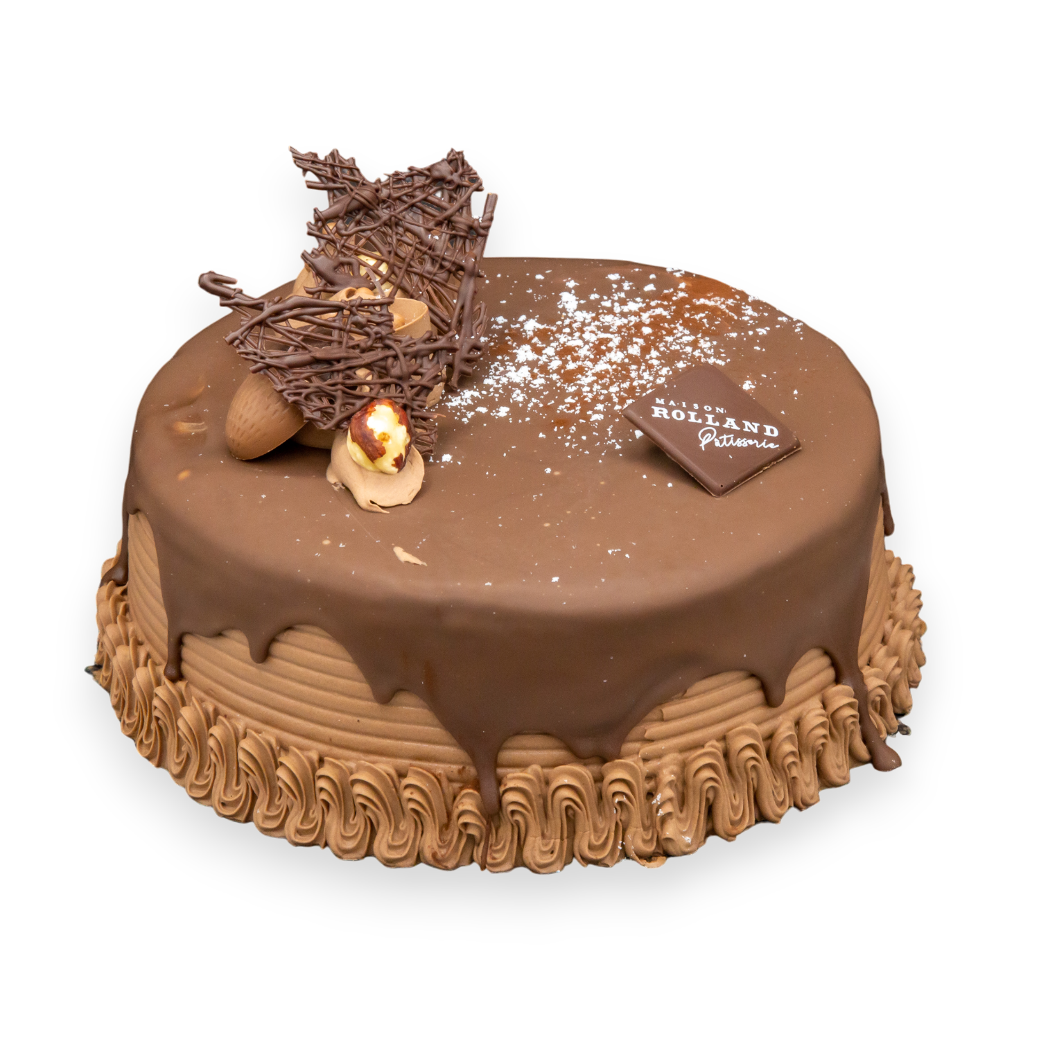 Pâte au chocolat, crème au beurre choco-noisette, pâte à glacer choco-noisette.