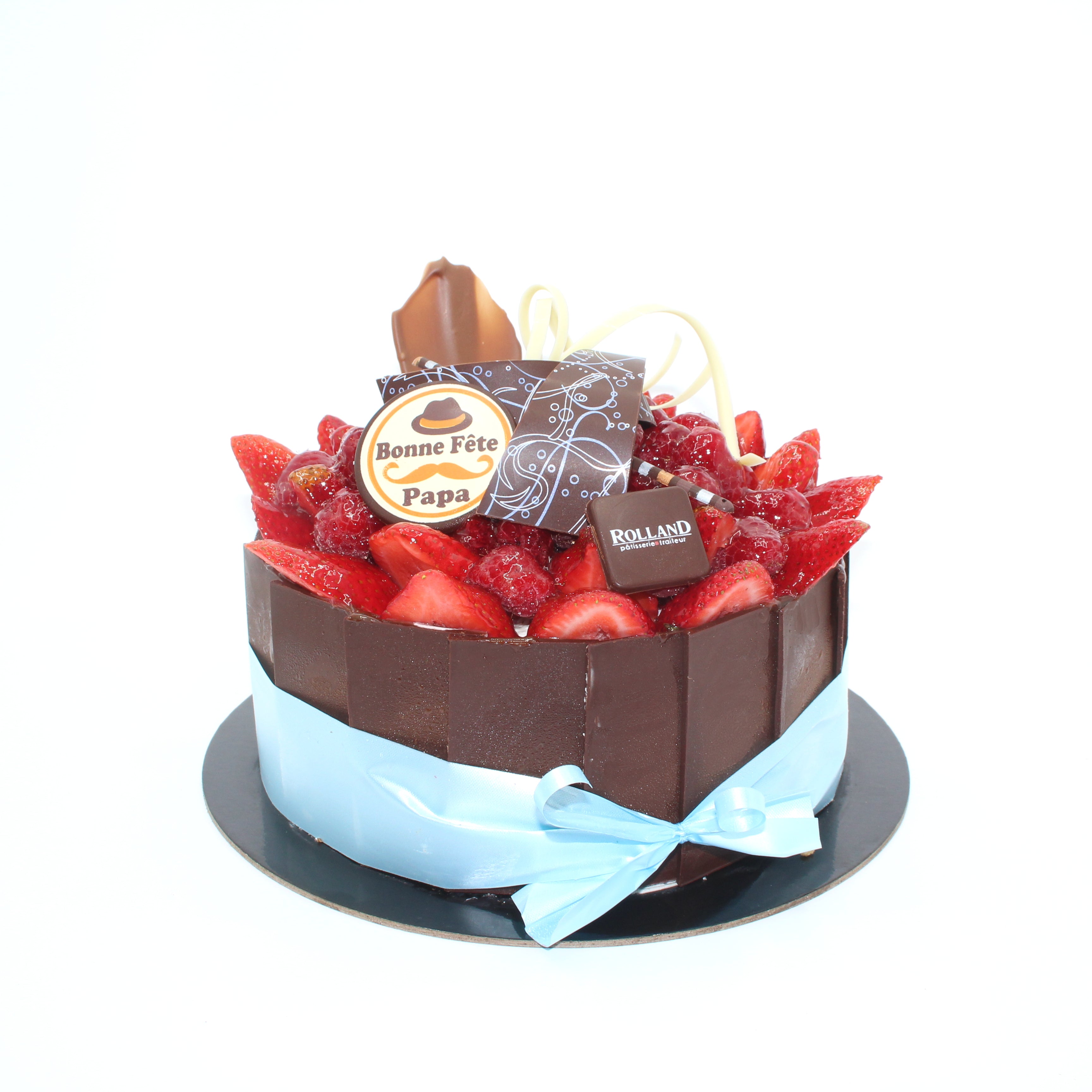 Génoise au chocolat, sirop de kirsch, crème chantilly, fraises fraîches, décoration en chocolat