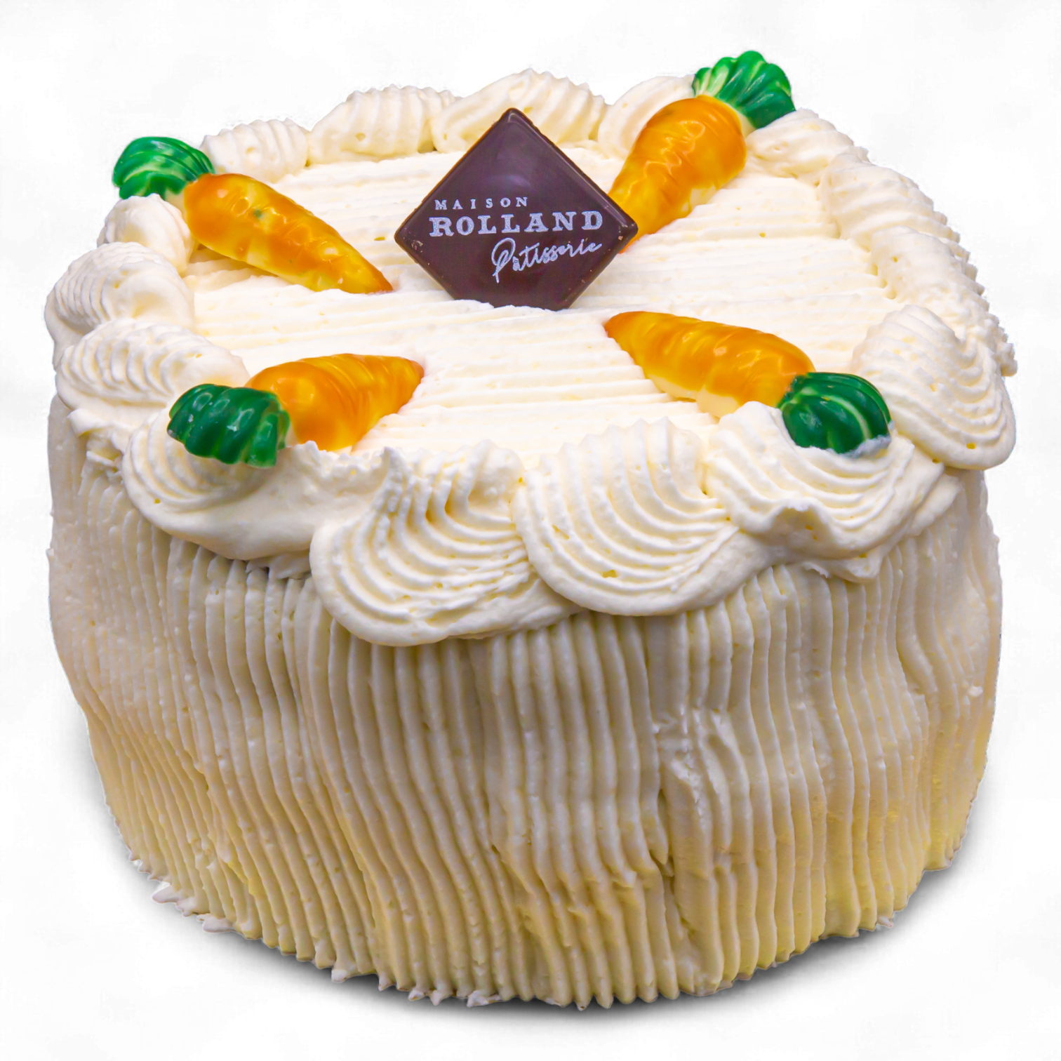 Gâteau aux carottes, crémage au fromage et décor chocolat.