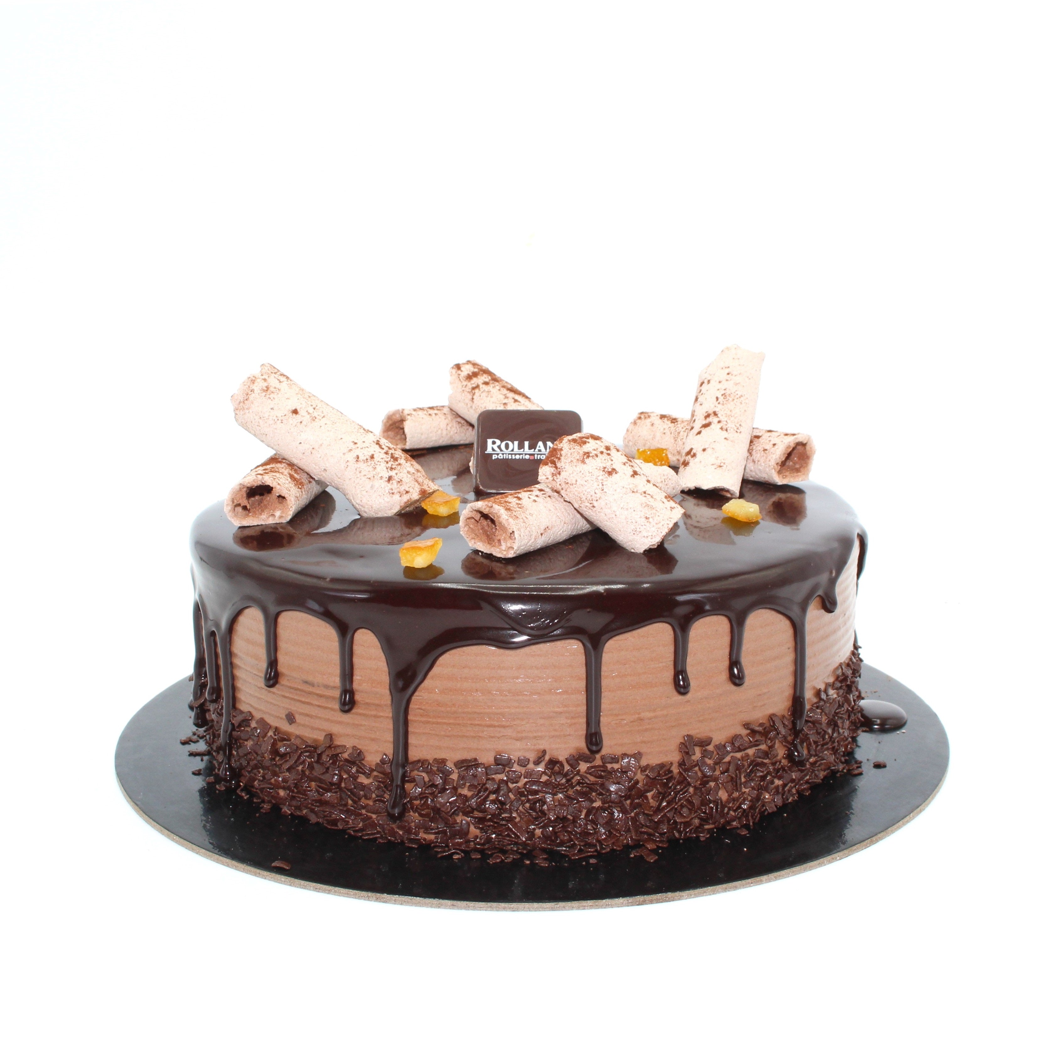 Pâte au chocolat, ganache à l’orange, crème légère au chocolat, crème au beurre au chocolat, miroir au chocolat, pailleté au chocolat.