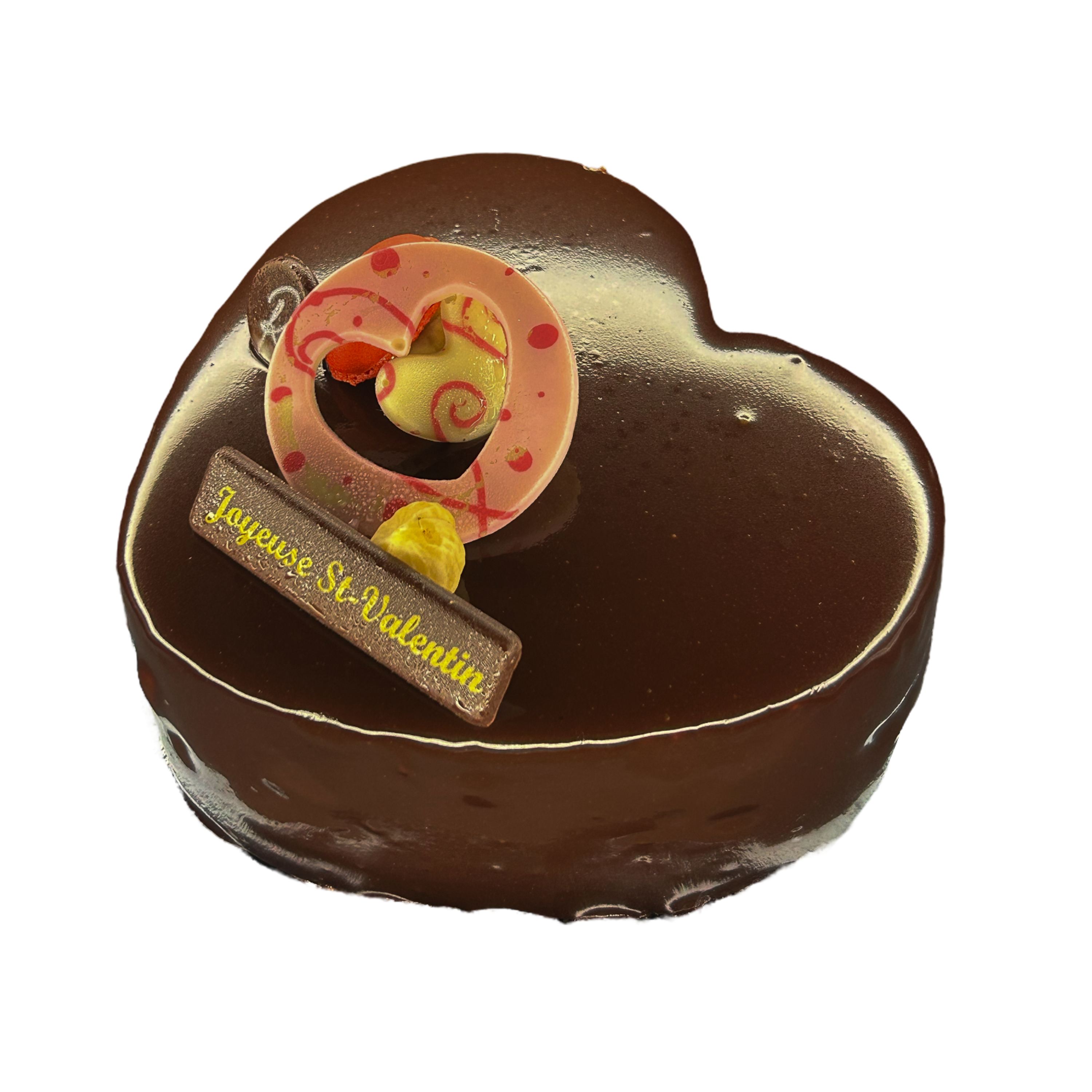 Biscuit dacquoise, feuilletine à la noisette, crème brûlée à la vanille, mousse Gianduja, miroir au chocolat noir