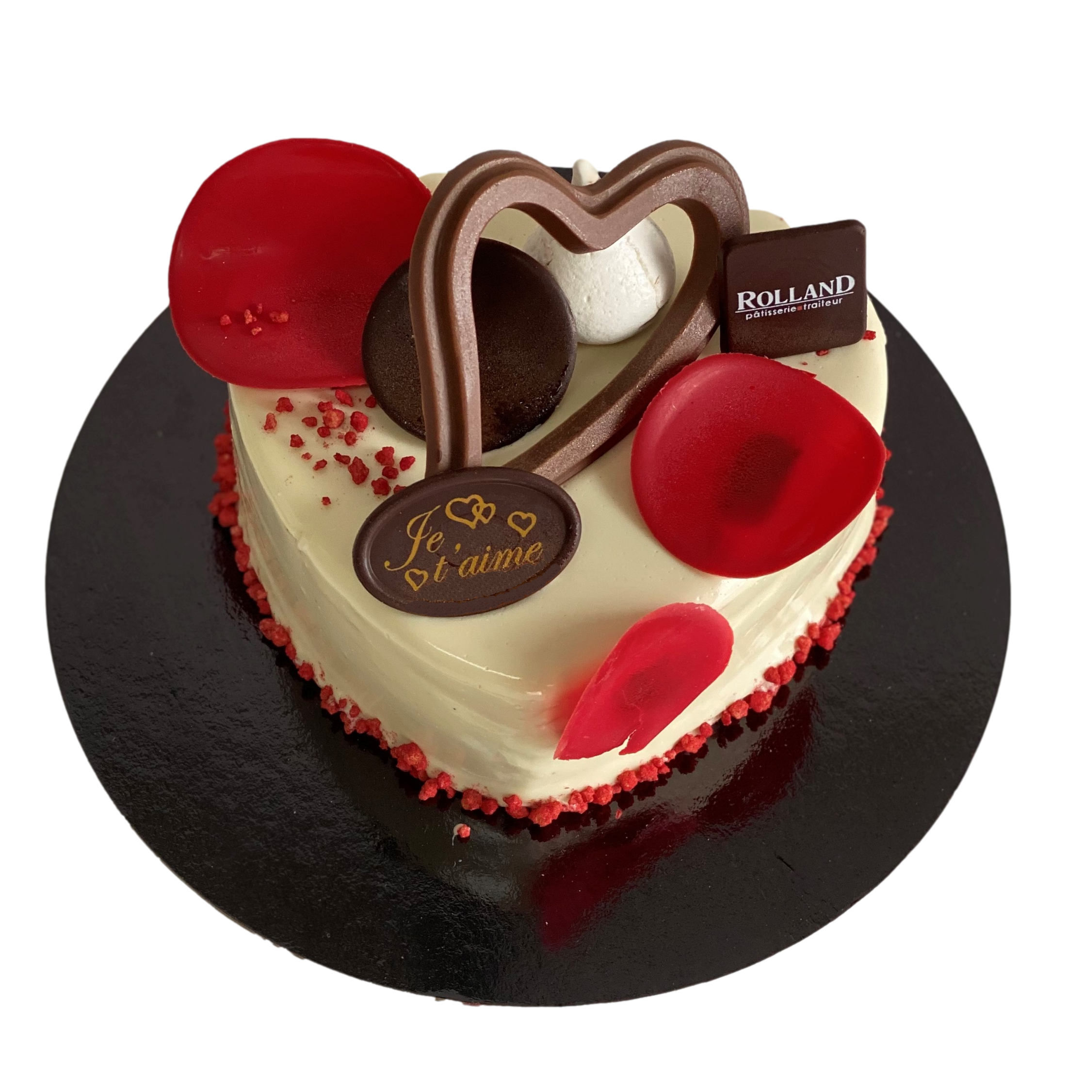 Biscuit aux amandes, mousse satin blanc, feuilletine Rice Krispies, crémeux pistache, crémeux framboise