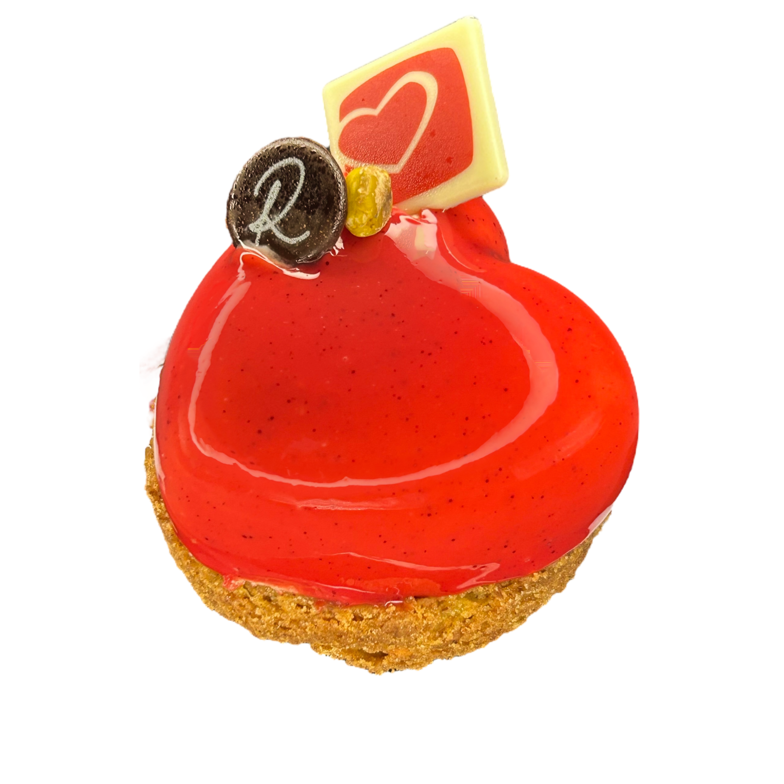 Biscuit sablé pistache, Compotée de fraises et framboises, Mousse pistache, Miroir rouge