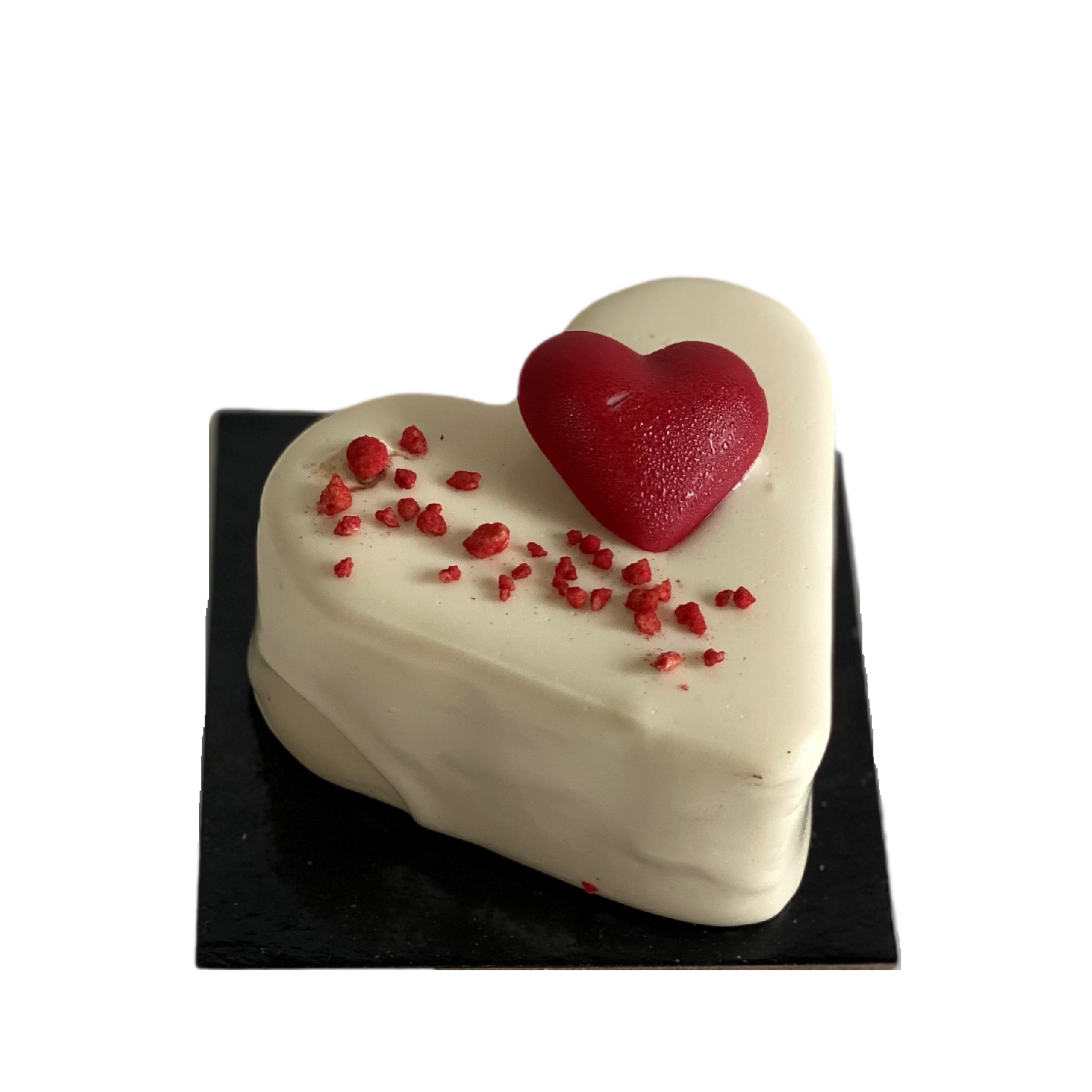 Biscuit aux amandes, mousse satin blanc, feuilletine Rice Krispies, crémeux pistache, crémeux framboise.