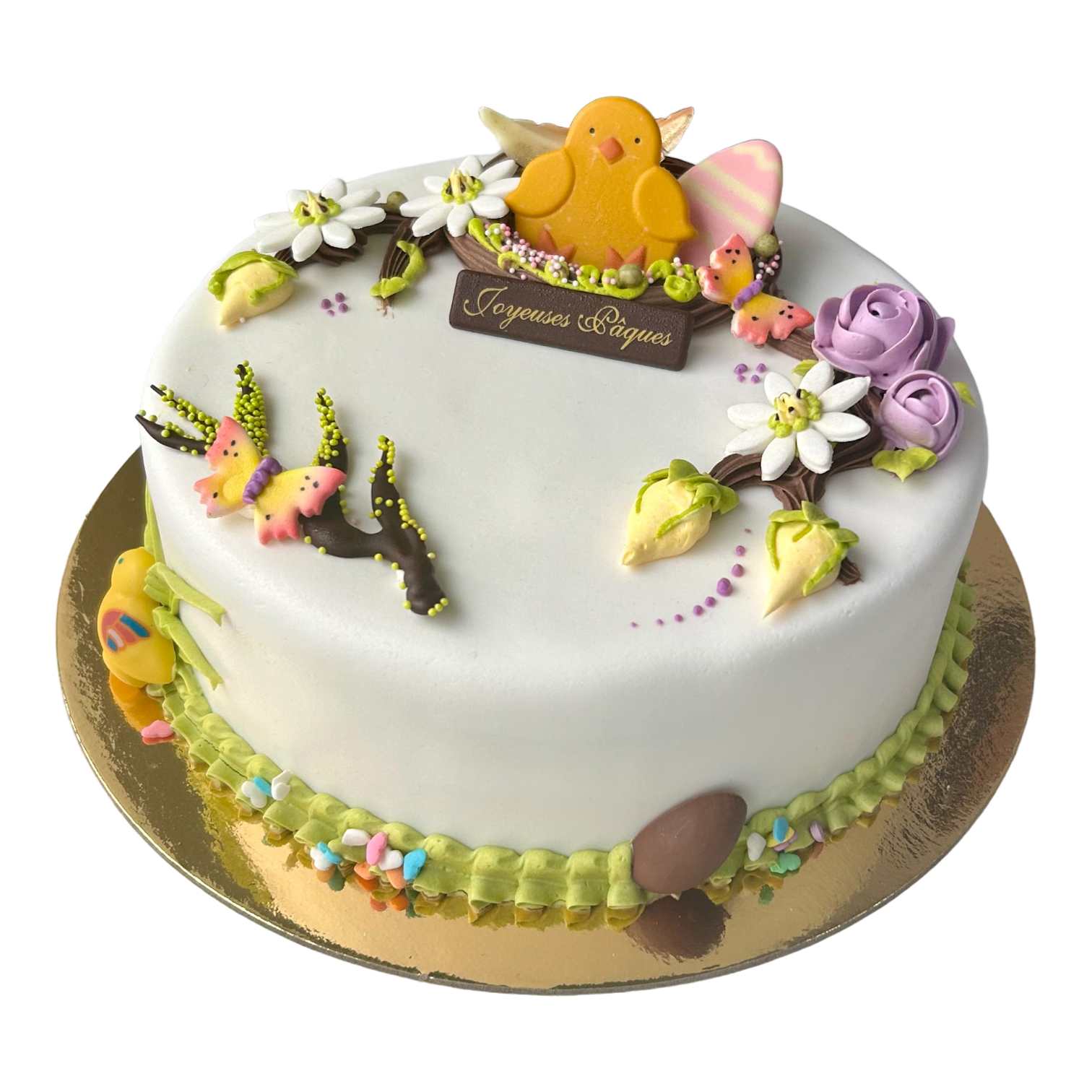 Pâte à la vanille, Crème au beurre à la fraise, confiture aux fraises maison, recouvert d’une pâte de sucre.