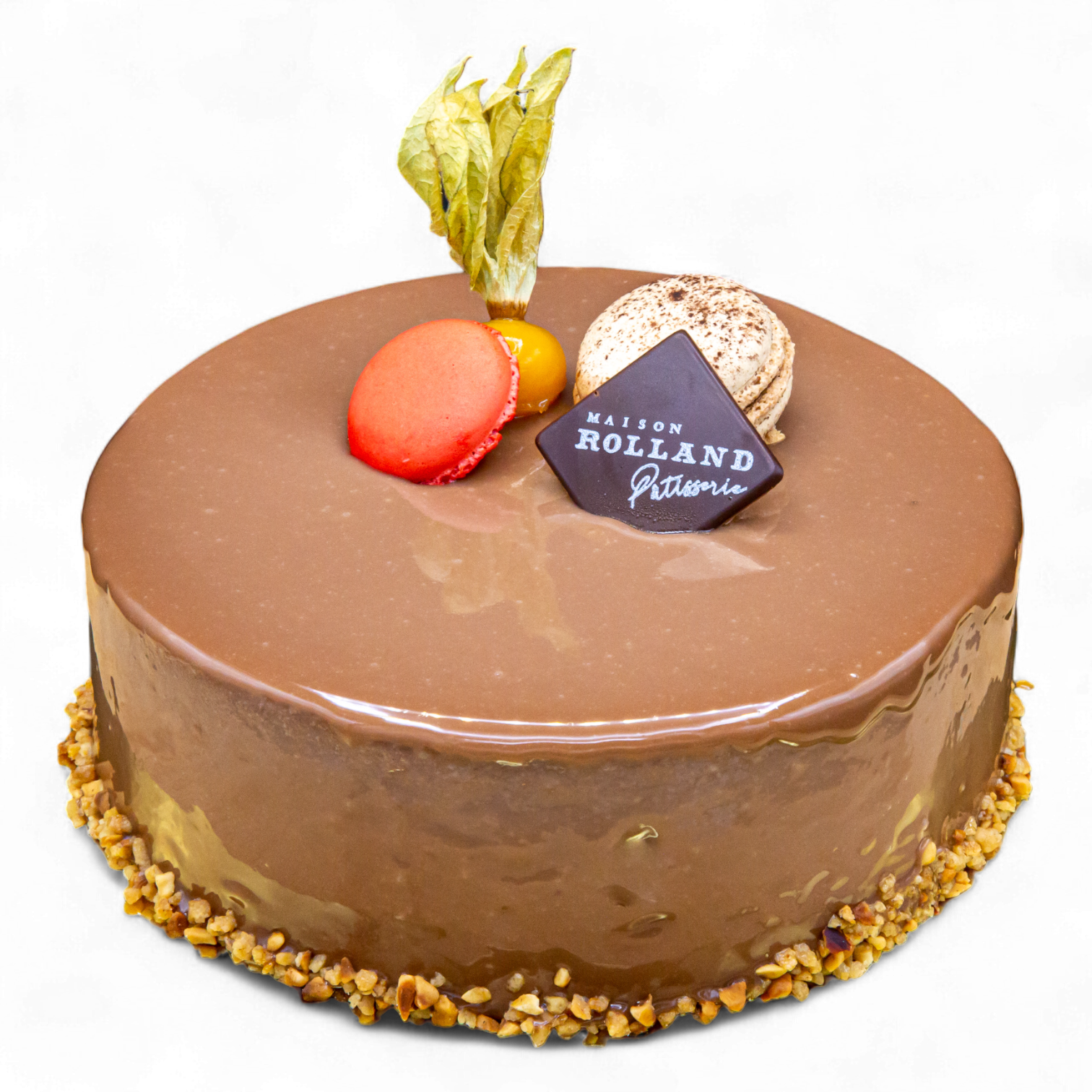 Biscuit chocolat caramel, crème légère vanille, mousse chocolat noir, miroir chocolat au lait.