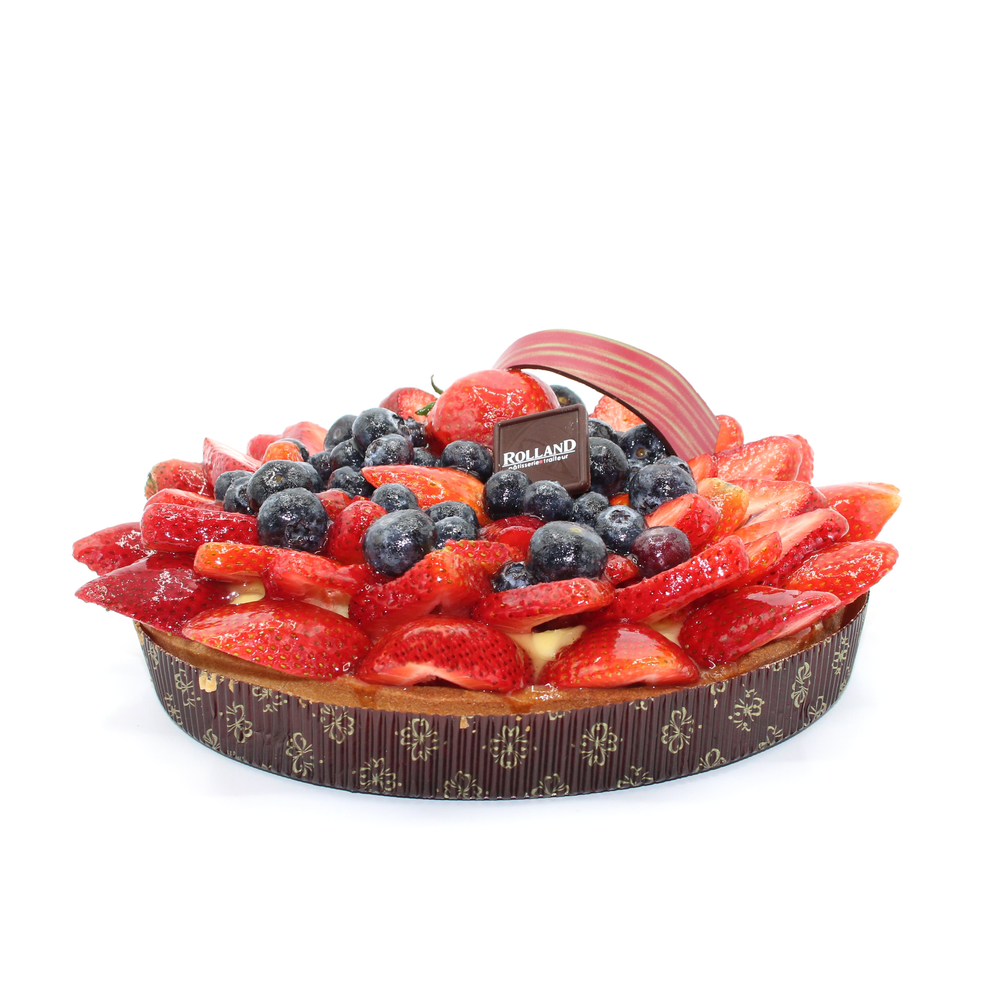 Pâte sucrée, ganache au chocolat, crème pâtissière, fraises et bleuets.